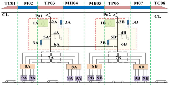 Equivalent model of the neutral zone (CL is contact wire, Pa1 is pantograph, 1A is voltage transformer, 2A is current transformer, 3A is arrester, 4A is earthing switch, 5A is breaker with operating voltage 25 kV and short-circuit current 25 kA, 6A is isolating switch, 7A is traction transformer, 8A is converter, 9A is traction motor, 1B–9B are the same devices as 1A–9A while they are spinning reserved).