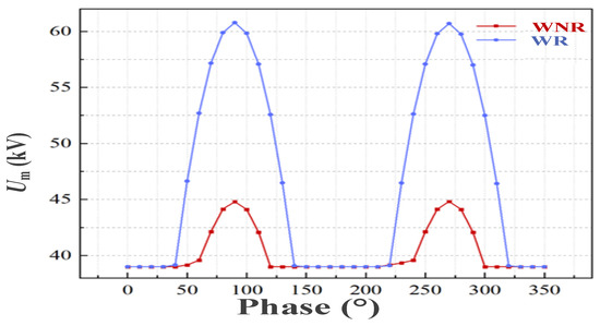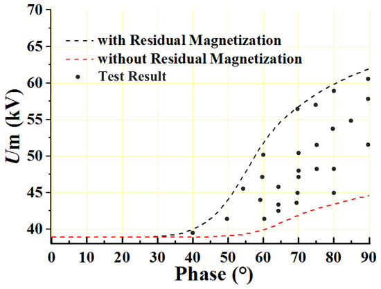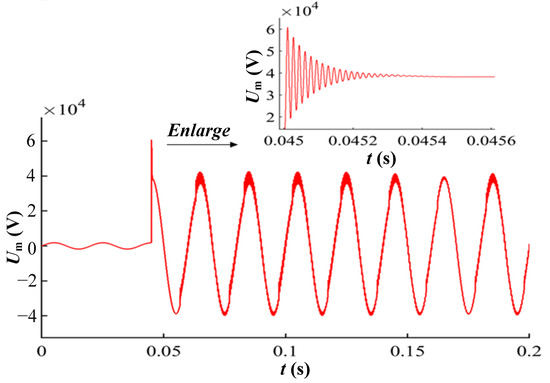 The circuit breaker has obvious overvoltage during operation. The overvoltage is larger near the peak value, and the overvoltage multiple is 2.0. Meanwhile, during closing at different phase angles, the overvoltage generated will be reduced (see Figure 17). When the closing angle is −65°, the circuit breaker is closed, and the overvoltage multiple is 1.1.