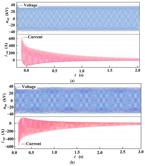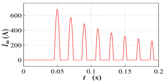 The measured inrush current is 623 A in the forward direction and 587 A in the reverse direction, and the attenuation time is 3 ms. Equation (9) shows that the magnetic core flux of the vehicle-mounted transformer consists of steady-state and transient-state components. The amplitude of the former is constant, and the latter varies with the closed initial phase angle α0 and the magnitude and direction of the transformer’s remanence Φr. The vehicle-mounted circuit breaker is closed when the traction power supply system’s grid voltage phase α0 = 0°, and the grid voltage is zero-crossing. After the circuit breaker is closed for half a period, the magnetic core flux of the transformer is maximum. The transient-state component changes at any time. Once the magnetic core flux in the vehicle-mounted transformer exceeds the saturation magnetic flux of the iron core, a magnetizing inrush current appears in the loop. If the iron core saturation is deep, the magnetizing inrush current in the transient state can be 6–8 times the rated operating current in the steady state.