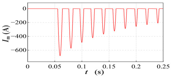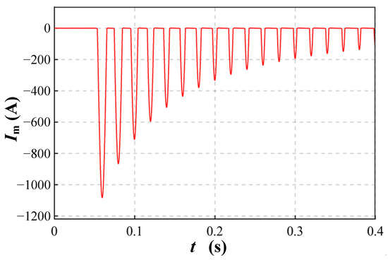 Magnetizing inrush current waveform on the primary side of the vehicle-mounted transformer when closing at 180° (Φr = 0.7 pu).