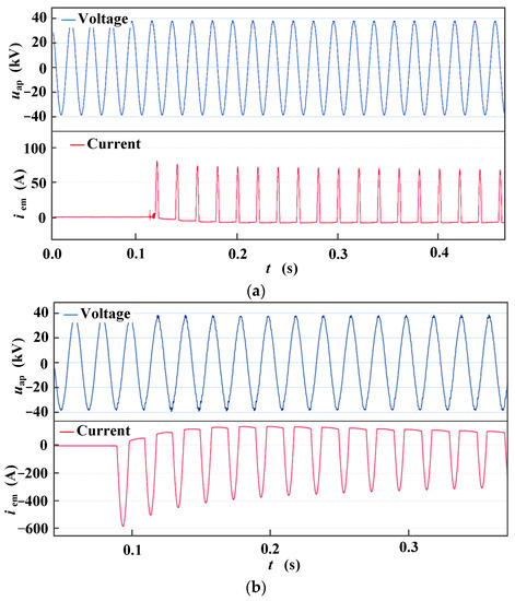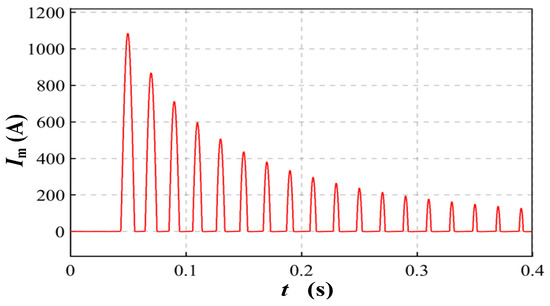 The closing excitation inrush current of the vehicle-mounted circuit breaker of high-speed EMUs has a great relationship with the remanence polarity and size of the vehicle-mounted transformer’s iron core. Figure 10 and Figure 11 show the excitation inrush current on the primary side of the transformer with the circuit breaker closing at 0° and 180°.