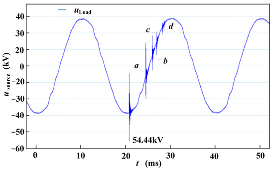 The circuit breaker has an obvious restrike in the closing process as shown at points a, b, c and d in Figure 19 with randomness. Multiple reignitions occur in severe conditions.
