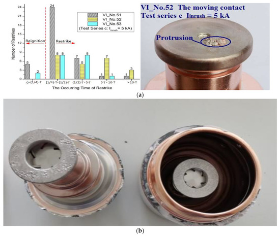 During the test, a heavy breakdown can be found through voltage test waveforms (see Figure 25). The published literature already has a more thorough analysis of the phenomenon and characteristics of heavy breakdown. The number and amplitude of heavy breakdowns are related to the ablation position and ablation depth of the contact surface (see Figure 25a). When the circuit breaker is disassembled, the contacts of the circuit breaker have obvious ablation and aging. Compared with Ref. [2], contact ablation is an important cause of the heavy breakdown in the closing process of the circuit breaker.