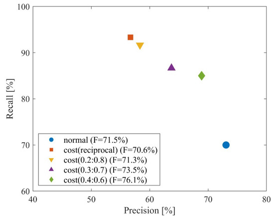 Figure 5 shows the relationship between precision and recall in normal and cost-sensitive learning. It can be confirmed that there is a trade-off between precision and recall. For example, in a cycle where a trained deep learning model predicts knocking, a countermeasure using the prediction can suppress knocking by the amount of recall and thus prevent damage to the engine. However, the same countermeasure is performed for normal cycles at the probability of 1 minus precision. So, it is important to balance the trade-off by changing the weights, considering the disadvantages of the countermeasure.