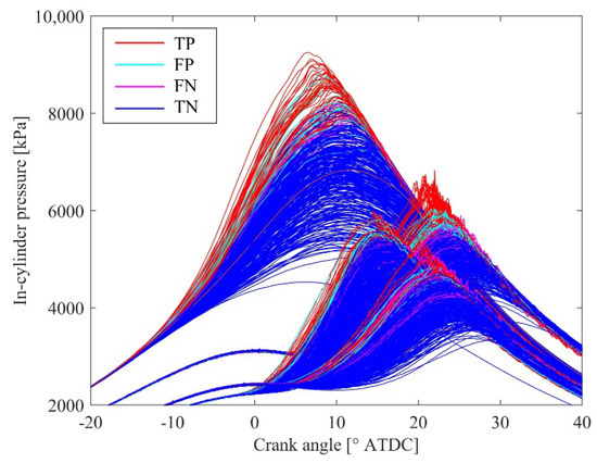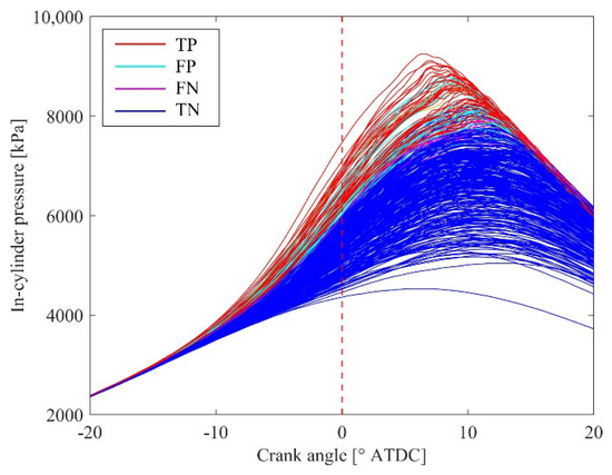 Overall, the higher cycles are predicted as knocking, while the lower cycles are predicted as non-knocking. However, multiple cycles corresponding to TN and TP intersect near the boundary. This indicates that the in-cylinder pressure at 0° ATDC is not the only factor used to determine the threshold, but that the rate of increase in in-cylinder pressure, the timing at which the pressure begins to increase, and the relationship between them are also considered.