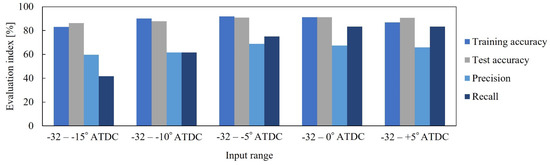In this section, the starting point of the in-cylinder pressure used in the input data was changed to compare the deep learning results when the input data include the in-cylinder pressure of the previous cycle or when the data are shortened. The five starting points vary from −720° ATDC, which is the top dead center of the previous cycle, to −32° ATDC, which is close to the spark timing of the target cycle. The end point of the input data was set to 0° ATDC. As mentioned above, the cost-sensitive learning of cost(0.4:0.6) was used. The other parameters were the same as described above. Training accuracy, test accuracy, precision, and recall are shown in Figure 6. The evaluation indices were similar for all ranges, and prediction was possible even for the shortest range, −32° ATDC–0° ATDC.
