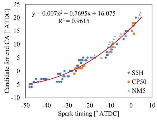 Relationship between spark timing and the candidate for the end CA, and the approximation formula.