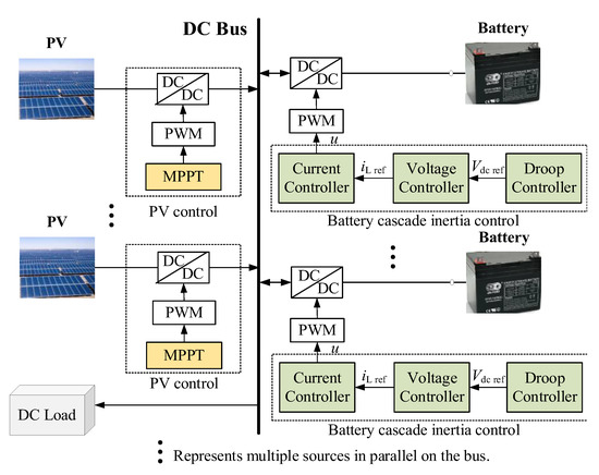 Maximum power point tracking (MPPT) control is designed to sustain the maximum power output of the PV battery, reduce power generation costs, and improve system efficiency [7]. Since several energy storage units connect to the DC bus in parallel, the power distribution per storage unit is the main control objective for the microgrid [8]. To avoid the various problems caused by communication technology, the power distribution for each unit can be achieved via droop control without communication [9], which is more appropriate for distributed DC microgrids [10]. However, droop control also has certain limitations [11]. Conventional droop control involves contradictions between voltage deviation and current distribution accuracy owing to the presence of cable impedance [12].
