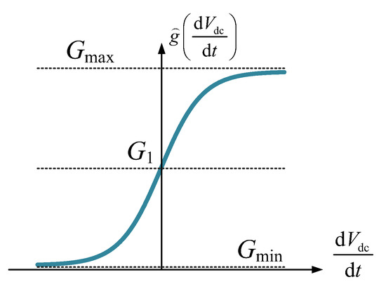 The curve of the new dynamic flexible droop coefficient is shown in Figure 3. If the absolute value of dVdc/dt is small, the droop coefficient curve approximates a straight line with a fixed slope G2. If the absolute value of dVdc/dt is large, the droop coefficient will not exceed the limit due to the limit of the hyperbolic tangent function tanh (·). The battery can provide appropriate inertia for the DC microgrid regardless of whether the load fluctuation is large or small.