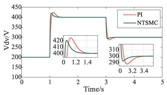 In order to further demonstrate the advantages of NTSMC controllers, we used NTSMC and PI, respectively, to compare the tracking performance with regard to voltage and current references. The overshoot and response time of the output voltage Vdc were compared in detail when the reference voltage changed. The Performance analysis and comparison of NTSMC and PI are shown in Table 1.