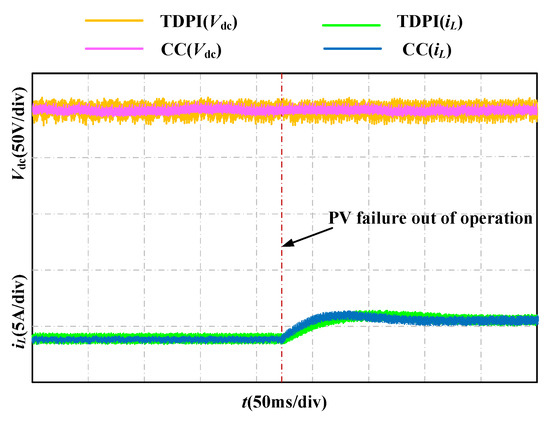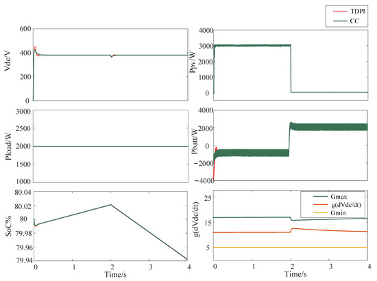 This simulation scheme analyzes the impact of out-of-operation PV failure on the system. From time = 0 s to 2 s, the PV output power remains at 3000 W, and the load power remains at 2000 W. When time = 2 s, the PV suddenly fails to run due to being out of operation, and the PV output power is zero. The simulation results are shown in Figure 7. The battery uses the CC method for the isolated PV-battery DC microgrid, and it is compared with the TDPI method.