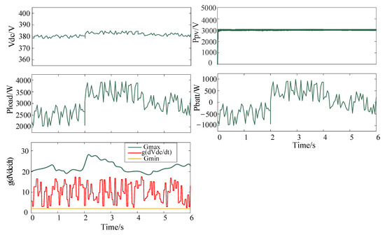 To verify the effect of the CC method proposed in this paper on the continuous dynamic change, the system was simulated under the condition involving a continuous load fluctuation. The output power of the PV remains at 3000 W. From time = 0 s to 2 s, the load power fluctuates randomly within the range of 2000~3000 W; from time = 2 s to 4 s, the load power fluctuates randomly within the range of 3000~4000 W; from time = 4 s to 6 s, the load power fluctuates randomly within the range of 2500~3500 W. Figure 8 shows the simulation results under the condition involving continuous load fluctuation.