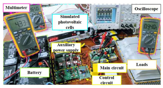 The hardware for the experiment platform is shown in Figure 9. In the experiment, the voltage source series resistance was equivalent to the photovoltaic cell, and the sudden change in illumination was simulated by switching the series resistance. A TMS320F28335 processor (TI Company) was adopted as the main control chip for the bidirectional DC/DC converter. The current measuring circuit of the converter used 10 mω copper wire as the sampling resistance. SiC-N-channel MOSFET was selected as the switch tube for the bidirectional DC/DC converter, adopting the unipolar PWM trigger mode. The PWM driving circuit of the bidirectional DC/DC converter adopted an IR2104 power driving chip and a 6N137 optocoupler chip.