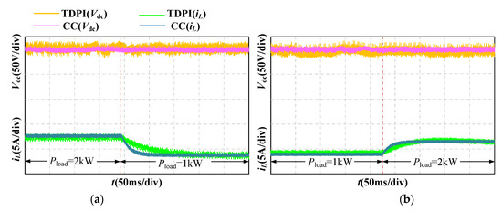 Figure 10 shows a comparison of the results for the battery converter output voltage Vdc and battery terminal current iL with the proposed CC and TDPI methods. In Figure 10a, Vdc ref is set as 250 V and the load power Pload decreases from 2 kW to 1 kW. In Figure 10b, Vdc ref is set as 250 V and the load power Pload suddenly increases from 1 kW to 2 kW.