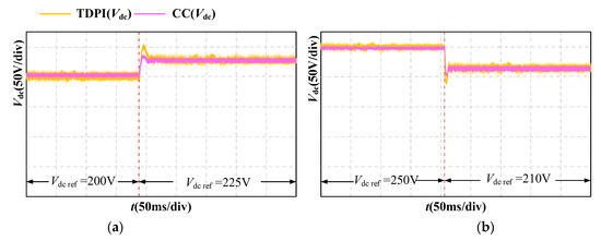 Figure 11a,b show the comparison of the results for the battery converter output voltage Vdc with the proposed CC and TDPI methods when the reference value of the battery converter output voltage Vdc ref suddenly increases from 200 V to 225 V and decreases from 250 V to 210 V, respectively.