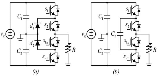 The first member of the family of MLI was the neutral point-clamped or diode-clamped converter, initially introduced in []. Its basic configuration is shown in Figure 1a. Figure 1b shows the basic configuration of the flying capacitor MLI.