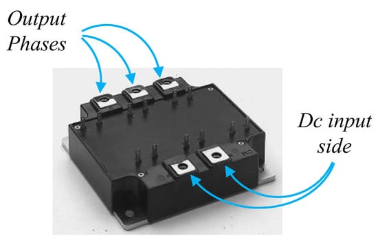 As mentioned before, the core of the switching stage is a full bridge or six-pack module of MOSFETS or IGBTs. Those six-pack modules are widely used to build low-power three-phase inverters (two levels); in this case, the inverter is a single-phase five-level inverter. Figure 2 shows a commercial six-pack module, indicating the output phases and dc input side, and the small connectors at the top are for gate drivers (a pair for each transistor).