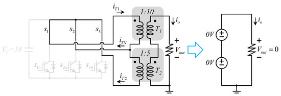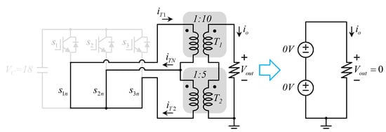 When the three firing signals are zero, the three upper switches (s1, s2, and s3) are open, and their complementary switches (s1n, s2n, and s3n) are closed, and the circuit behaves like the one shown in Figure 4. Note that the primary winding of both transistors is in a short circuit, in other words, connected to zero voltage, for which their output winding provides zero voltage to the load. In this state, the output voltage is zero.