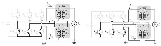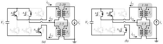 The zero-voltage state does not mean that the load current is zero, and the output current has a path to flow in case an inductive load is connected. In this switching state, the current through transistors that are closed can be expressed in terms of the output current and the transformer’s turn ratio as in (4)–(6):