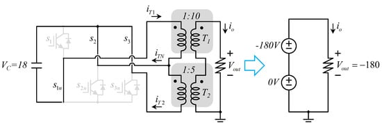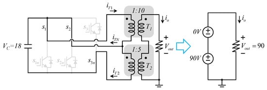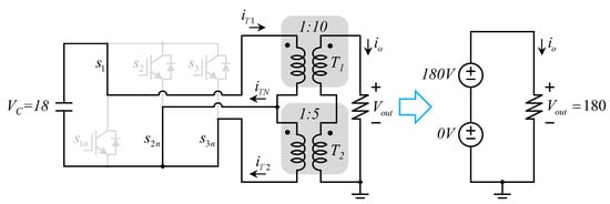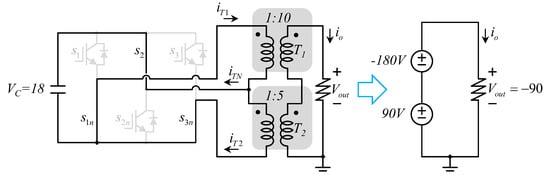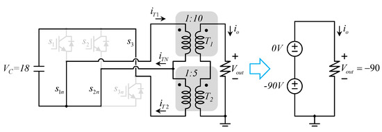 Table 1 also includes the information about the contribution of transformers, whether it is positive, negative, or zero. The last column indicates the output voltage considering that the turn ratio of transformer T1 is 1:10, the turn ratio of transformer T2 is 1:5, and the input voltage (the capacitor’s voltage) is 18 V.