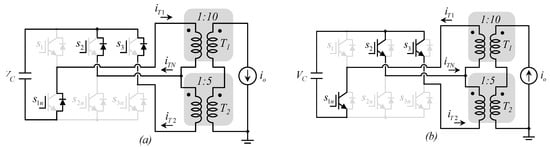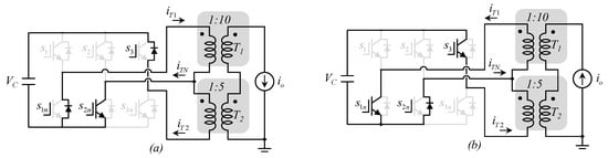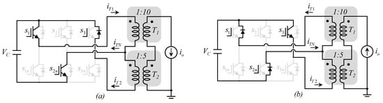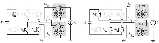 As in previous states, the converter must be able to operate with different output current directions to consider an operation with a power factor different than one. The load can be modeled as a current source. In case the current is positive, the current paths on the converter would look like that in Figure 11a, otherwise it would look like that in Figure 11b. Depending on the load current direction, in some switches, the current flows through the transistor, and in other cases it flows through the diode.