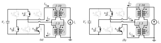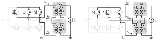 As in previous states, the converter must be able to operate with different output current directions to consider an operation with a power factor different than one. The load can be modeled as a current source. In case the current is positive, the current paths on the converter would look like that in Figure 13a, otherwise it would look like that in Figure 13b. Depending on the load current direction, in some switches, the current flows through the transistor, and in other cases it flows through the diode.