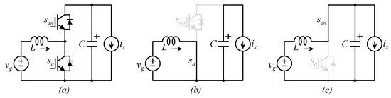(a) The boost pre-regulators and their equivalent circuits according to the switching state, (b) when sa = 1 (san = 0), and (c) when sa = 0 (san = 1).