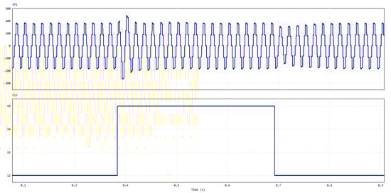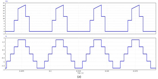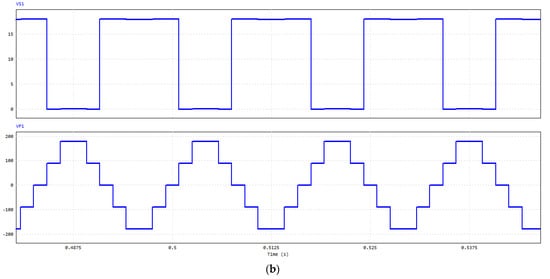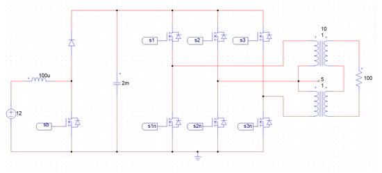 Figure 22 shows the simulation schematics, whereby the customizable power semiconductor element was used to simulate the transistors. All transistors have an antiparallel diode, which is a characteristic of the six-pack. The input voltage is 12 V, and the transformers’ turn ratios are also the same as in the analysis (1:10 for T1 and 1:5 for T2).