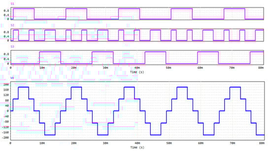 Figure 23 shows the switching signals (up) along with the output voltage, Vout. The voltage is consistent with what we expected, and with the waveform shown in Figure 20. The simulation shows that the proposed topology can make the voltage conversion from the dc input to the five-level output.