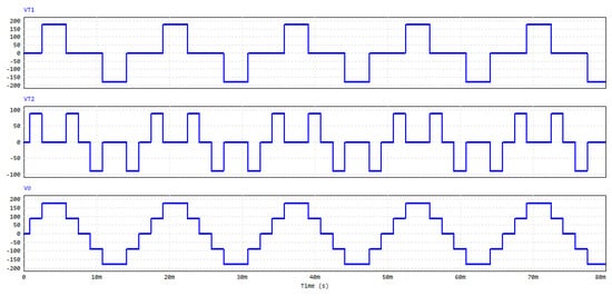 Figure 20 also shows the output voltage (Vout), the ideal sinusoidal waveform is shown in light gray, and the real stepped waveform is shown in black, and this is the multilevel waveform, with five levels. Finally, Figure 20 also shows the voltage at the secondary winding (output) of both transformers (T1 and T2). VT1 (180 V peak) has twice the peak amplitude of VT1 (90 V peak).