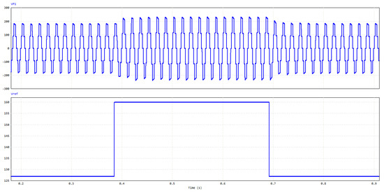 The second test consisted in changing the output voltage setpoint reference of the converter while keeping the input voltage constant. The reference was changed from 127 to 160 VRMS and back, and from 127 to 100 VRMS and vice versa. The results of this test can be seen in Figure 28. As can be observed, the output voltage followed the reference after a short transient of a few milliseconds, and it is worth mentioning that although the changes in the reference were suddenly made, the converter followed the control commands properly.