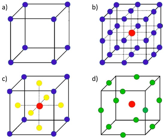 Three-factor response surface designs: (a) Two-level full factorial, (b) Three-level full factorial, (c) Face-Centered Central Composite, and (d) Box–Behnken designs. Blue dots: factorial, red dots: center, green dots: edge, yellow dots: axial (star).