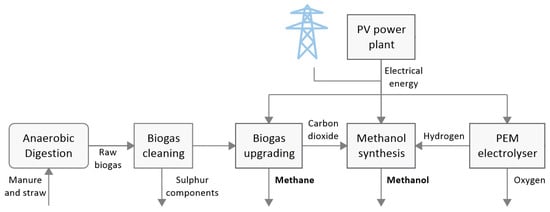 Figure 3 displays the conceptual block diagram of the system under investigation. Raw biogas is produced from the anaerobic digestion of organic materials from manure and straw. Biogas is processed through biogas cleaning and upgrading to increase energy density by separating hydrogen sulfide and carbon dioxide from biomethane. Methanol is synthesized based on carbon dioxide generated from the upgrading process and hydrogen produced by a PEM water electrolyzer. A PV power plant is installed to supply the electrical energy for methanol and methane production. Purchasing the necessary electricity from the grid is assumed when solar energy is unavailable. Thus, the PEM water electrolyzer can switch between solar energy and grid electricity (and vice versa) without affecting its functionality [32]. The plant is expected to operate 7900 h per year (90% operating factor), a value within the recommended range to yield lower production costs for the methanol synthesis unit and the PEM electrolyzer [33,34]. Next, a description of the system’s main components under investigation is given.