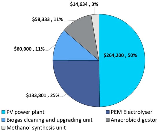 The breakdown and percentage distribution of the PEC are reported in Figure 4. Representing 50% and 25% of the PEC are the PV plant and PEM electrolyzer, the most expensive components. The biogas upgrading and anaerobic digestor unit costs equal 11% of the PEC. The methanol synthesis unit represents the lowest cost, accounting for only 3%. The resulting TCI equals about USD 1.3 million, and the annual cash inflow in Table 5 is USD 129,279; therefore, the base case presents a PBP of 10.3 years. The reference case plant has exceeded the 10-year PBP threshold, so it is not economically viable in this case. Hence, sensitivity analysis should be performed to identify the minimum PBP.