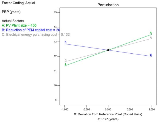 Plotting the perturbation factors allows for comparing all factors’ effects at a particular point. Figure 5 shows all factors’ effects at the design space’s midpoint. As the value of the PV plant size (A) and the electrical power purchase cost (C) increase, the PBP consequently increases. Conversely, the increasing reduction in PEM capital cost (B) decreases the response PBP. As expected, the remotion of the interaction terms AB and AC improved the model’s accuracy by reducing the difference between the Adjusted R2 (94.92%) and Predicted R2 (86.06%) to 0.0886 in Table 10. The R2 of the model indicates it can explain 98.12% of the variation in the response variable around its mean. Adequate precision in Table 10 is a signal-to-noise ratio that contrasts the predicted values range at the design points with the average prediction error. As ratios above 4 indicate adequate model discrimination, 33.257 suggests an adequate signal.