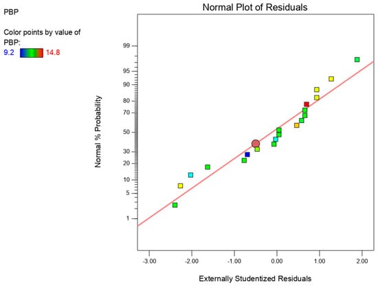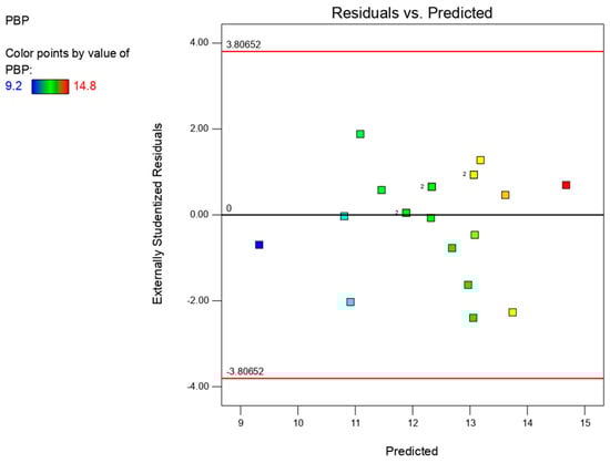 The assumption of the independence of errors means there is no relationship between the residuals of our model and the response variable (PBP). In the residuals versus predicted plot, Figure 7, the residuals seem randomly scattered, and the correlation is around zero. Therefore, this assumption is satisfied. The homogeneity of variance assumption states that independent groups must have the same or similar variance. Figure 7 indicates no apparent pattern or unusual structure, which means that the residues are randomly distributed. The residual analysis suggests no reason to suspect any violation of the constant variance or independence assumption. Consequently, the proposed model is sufficient to explore the design space.