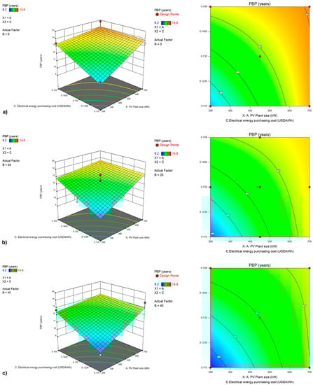 Three-dimensional and their corresponding contour plots based on the regression model were generated to illustrate how the factors affect the PBP. These curves can represent the interaction between the combinations of factors, visually revealing their influence on the PBP response. Drawing on the statistical analysis results that point out the influence of electrical energy purchasing cost, the size of the PV plant, and the interaction of both factors on the PBP, the response surface analysis focuses on the regression surface generated by both independent variables.