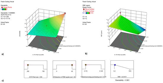 Desirability functions are a method to optimize models. Optimization objectives may be set to minimize, maximize, or obtain the response’s target value. Desirability function values lie between 0 and 1. A value of 0 indicates that the factors provide an undesirable response, while 1 indicates that they perform optimally. The desirability function plots of this model are given in Figure 9. The desirability of 0.961 is achieved at a 200 kW PV plant size, a reduction in the PEM capital cost of 40%, and USD 0.115 per kWh of electrical energy purchasing cost, resulting in a PBP of 9.4 years (Figure 9c).