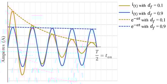 The influence of the damping factor “df” on the current waveform (i(t)) is graphically represented in Figure 3. As shown in Figure 3, the damping factor defines how sinusoidal the current waveform is, where, if fully sinusoidal waveforms are required, it is necessary to use high damping factors to prevent the current from decaying significantly, and, where using a damping factor of “df = 0.9” is equivalent to an almost sinusoidal waveform. Figure 3 also shows the exponential factor (), which is the factor that defines the decay of the current up to half of the switching period (T/2). The following is to determine the value of the constant “k” as a function of the circuit parameters:
