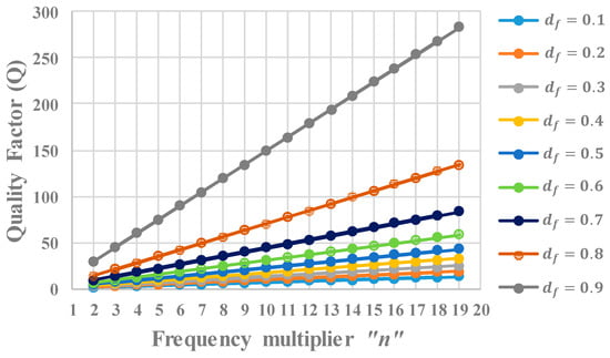 Quality factor with fixed damping factor “df” for odd and even values of the multiplier “n”.