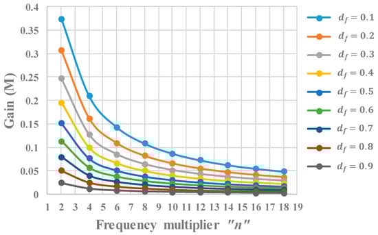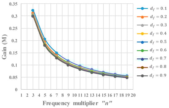 where constant “c” can be for even values “ceven” or odd values “codd”. As shown in Equation (34), the gain of the circuit can vary as a function of the values of the constants “a”, “b”, “c”, and the duty cycle. However, the variation of the duty cycle would affect the current waveform and its symmetry, thus, a fixed value of D = 50% was considered in the circuit analysis. Since two equations define the value of the constant “c”, it is possible to plot the gain of the circuit with odd and even values of “n” for different values of the damping factor “df”. Figure 6 shows the gain of the circuit “M” with even values of “n” and a fixed damping factor. Figure 7 shows the gain of the circuit “M” with odd values of “n” and a fixed damping factor. As shown in Figure 6 and Figure 7, the circuit gain for both cases using even and odd values of “n” tends to decrease as the multiplier increases. As shown in Figure 7, when using odd values of “n”, the circuit gain does not vary significantly when using different values of the damping factor “df”, when compared to using even values of “n” as shown in Figure 6. This difference in gain behavior when using even or odd values of “n” shows that it is convenient to use odd values of “n” since, if a sinusoidal current is required in the resonant tank, a damping factor of “df ≥ 0.9” must be used. Using even values of “n” is less convenient because the gain is very small, as shown in Figure 6.