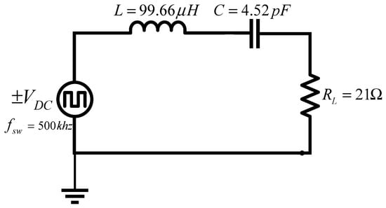 In this work, frequency multiplication is achieved by operating in the transient stage and without the need for special devices or complex control methods, which only raise the overall cost of the circuit and add complexity to the design. It is also possible to work with much higher power levels. This transient design methodology has not been reported before and can be used in applications where high operating frequencies are required without the need to work with very low power levels. As shown in Figure 1, this design methodology could be used in resonant circuits that have an inverter stage that can generate a certain switching frequency, since the inverter output voltage can be replaced by a bipolar square voltage source.