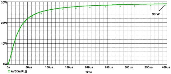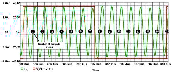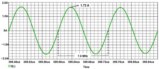 As shown in Figure 9 and Figure 10, the values of the RMS voltage and the average power obtained in the simulation are the same as the proposed values in Table 1 (Vout = 25 V, Po = 30 W). Figure 11 shows the current in the resonant tank oscillating at the proposed frequency of 7.5 MHz (fo = fswn) with the calculated peak current value of 1.72 A. Figure 12 shows the voltage level in the resonant capacitor in the middle of the switching period, which is equal to the DC voltage multiplied by the value of the constant “codd” (VC = coddVDC). Figure 13 shows the current in the resonant tank (sinusoidal waveform) and the voltage applied at the input of the circuit (square waveform). As can be seen in Figure 13, the frequency of the current in the resonant tank is multiplied fifteen times “n = 15” the switching frequency of the square bipolar voltage source. Furthermore, the current waveform shows that the maximum value of the current is decaying with a damping factor of “df = 0.9” (almost sinusoidal) as defined in Table 1. The results shown in Figure 9, Figure 10, Figure 11, Figure 12, Figure 13 and Figure 14 demonstrate that the methodology for operating the RLC circuit in a transient state, acting as a frequency multiplier, was correctly designed since they are very close to the theoretical values shown in Table 1 and Table 2.
