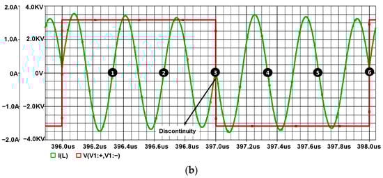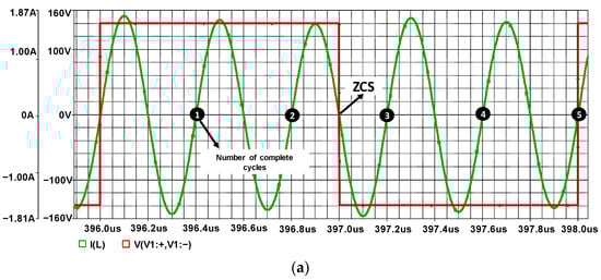 Current in the resonant tank (sinusoidal waveform) with different values of “n”. (a) Current in the resonant tank with an odd value of “n = 5” and ZCS. (b) Current in the resonant tank with an even value of “n = 6”.