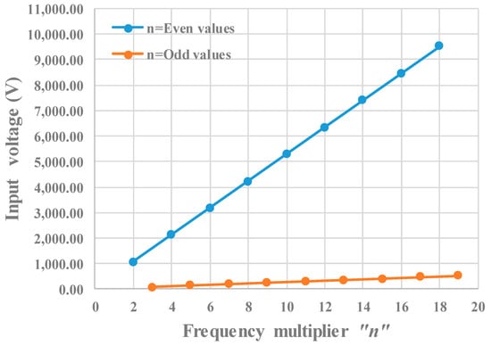 Input supply voltage (VDC) required for different values of the frequency multiplier “n” with the same output power (Po = 30 W).