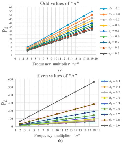 Power demand rate (Pd) from the power supply for different values of the frequency multiplier “n”, same output power (Po = 30 W), and fixed damping factor “df”. (a) Power demand rate (Pd) for odd values of “n”. (b) Power demand rate (Pd) for even values of “n”.