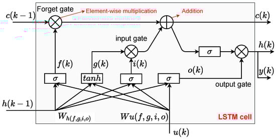 where are the weight matrices applied to the input vector and are the weight matrices of the previous short-term state . In this equation, ⊙ is an element-wise multiplication and are the biases. In Equations (1a)–(1f), is the input gate, is the forget gate, is the cell candidate, is the output gate, is the cell state, and is the hidden state. Two activation functions are used in Equations (1a)–(1f), which are given as: (i) activation function: