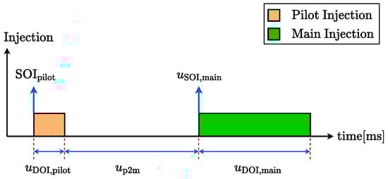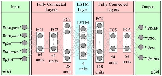 To model the CI engine emissions, a deep neural network with seven hidden layers, including 6 Fully Connected (FC) layers and one LSTM layer, is proposed, as shown in Figure 2. The input of this model is the start of injection (SOI) for the main injection (), duration of injection for both main () and pilot injection (), duration between the end of pilot injection and the start of main injection pre-2-main time (), and fuel rail pressure (). The pre-2-main time is used instead of the SOI of pilot injection () to allow for hardware constraints which limit the minimal time between injections to be implemented in the controller. This is necessary to prevent unintended overlapping injections where the injector has not fully closed. Figure 3 shows the relationship between SOI and DOI for both injections, as well as . The outputs of this model are nitrogen oxides (), Particle Matter (), Maximum Pressure Rise Rate (), and Indicated Mean Effective Pressure ().