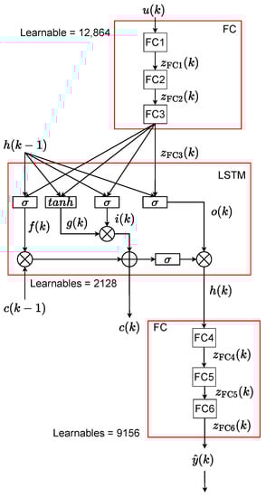 To capture the nonlinearity with the LSTM, more LSTM hidden units are needed, which result in a high number of hidden states and cell states. This resulted in a high computational cost for the MPC controller to find an optimal solution during real-time implementation. In our real-time implementation, doubling LSTM hidden units resulted in approximately doubling computational turnaround time from 63 ms to 130 ms, while this time must be within one engine cycle time (e.g., 80 ms at 1500 rpm) for cycle-by-cycle control. Instead of increasing LSTM hidden units, the Fully Connected (FC) layers are added before and after the LSTM layer to boost the network’s capacity for estimating the engine’s nonlinearity without significantly increasing the number of hidden and cell states.