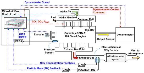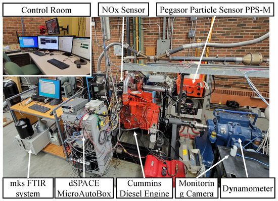 Experimental data were collected from a 4.5-liter medium-duty Cummins diesel engine to parameterize the model. The schematics of the experimental setup of the Cummins QSB4.5 160 diesel engine is shown in Figure 5 and Figure 6. emission concentration from the engine are measured using a Bosch sensor with ECM electronics (P/N: 06-05). A Pegasor Particle Sensor (PPS-M) is used to measure Particle Matter (PM). Additional details regarding the experimental setup can be found in [3,40,41,42].